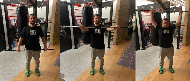 Stând în picioare, bastonul apucat la nivelul umerilor, ridicarea bastonului